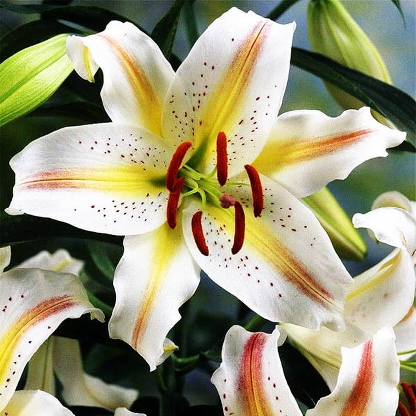 Луковицы лилии восточной горшечной Гарден Парти (Lilium Garden Party) — это пышное компактное растение для дома или сада. В высоту кусты достигают не более 40 см, в конце лета на них появляются цветы до 15–17 см в диаметре. Они распускаются в большом количестве, поэтому за ними практически не видно зелени. Лепестки белые, с тонкой желтой полосой по центру, а также имеют ярко-красный крап и пыльники в тон. Лилия Гарден Парти подходит для выращивания в открытом грунте и в горшках. Она отличается высокой морозостойкостью и легко зимует под укрытием. В домашних условиях Лилию восточную горшечную Гарден Парти можно выращивать в любое время года, и она будет радовать ярким обильным цветением.