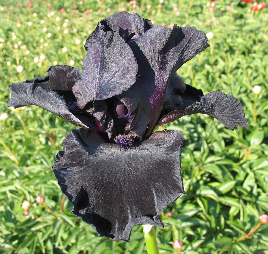 Ирис Before The Storm отличается однотонным антрацитово-черным цветком, горизонтальные края завернуты вниз, черная с бронзовым верхом. Считается самым черным. Хорошо растет и размножается.